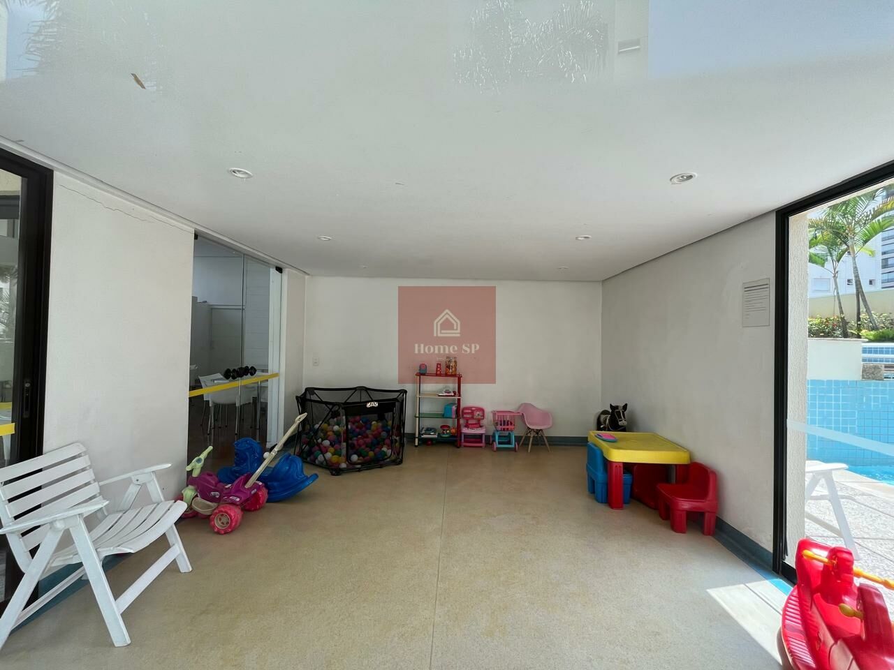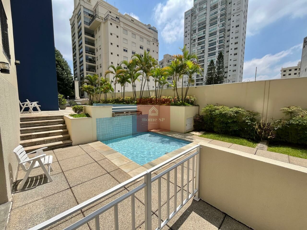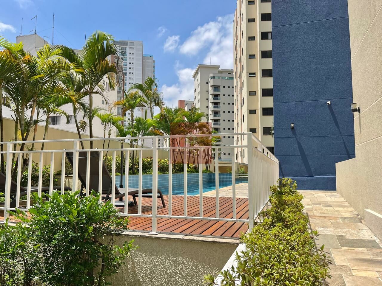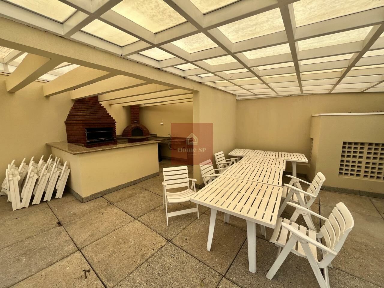 Condomínio com piscina, salão de festas, churrasqueira e forno de pizza.