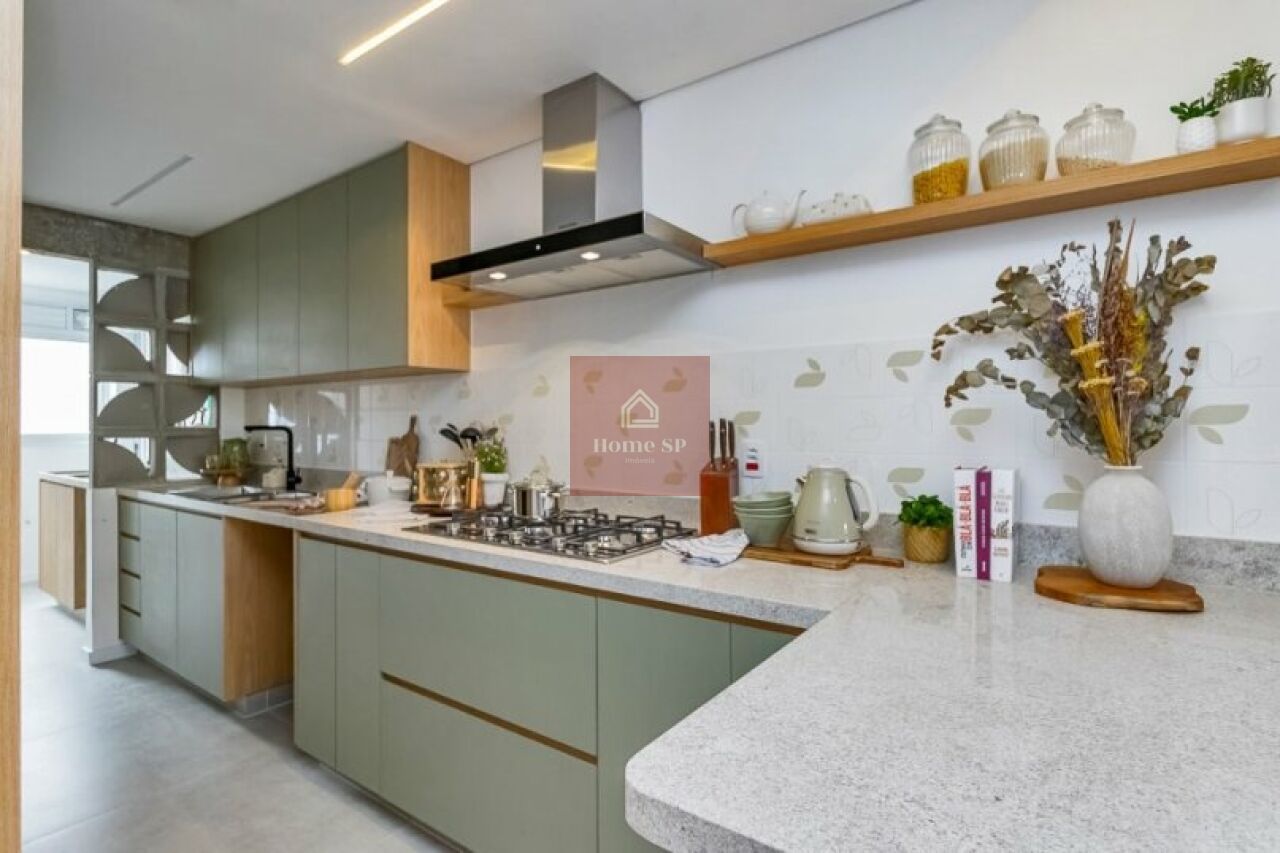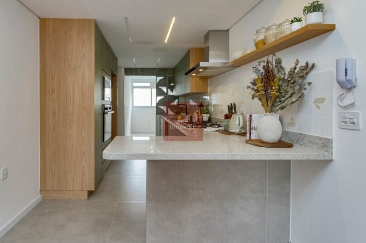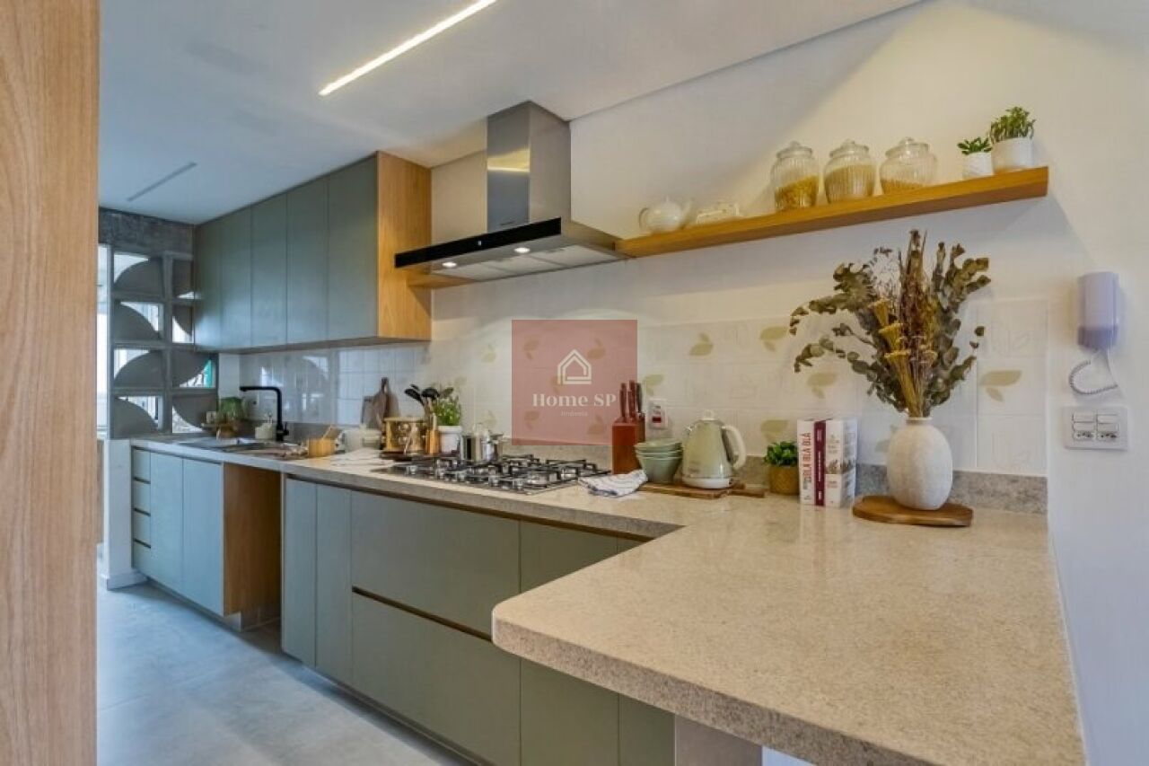 A cozinha moderna é equipada com fogão, forno elétrico, forno micro-ondas e coifa, oferecendo praticidade e funcionalidade no dia a dia.