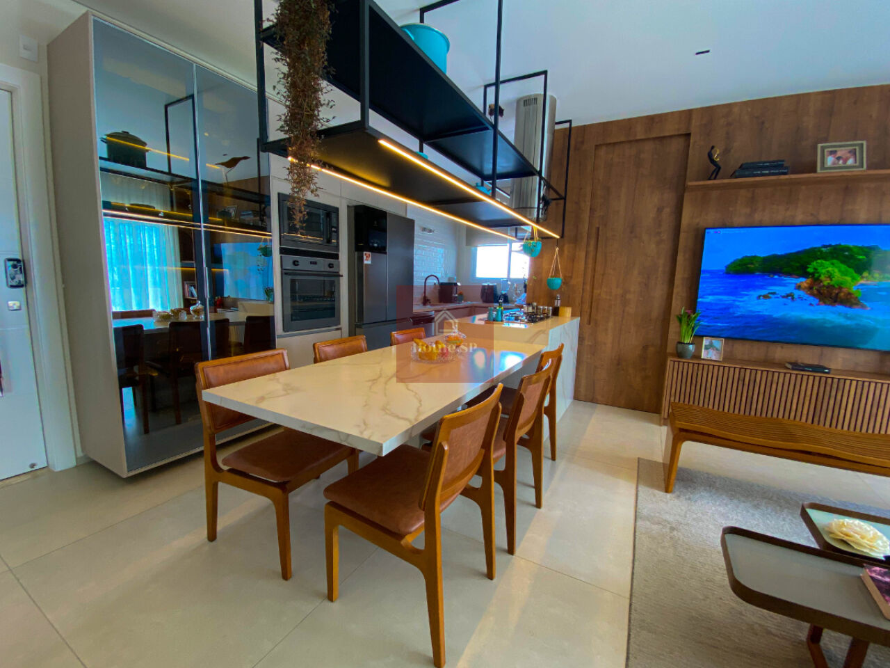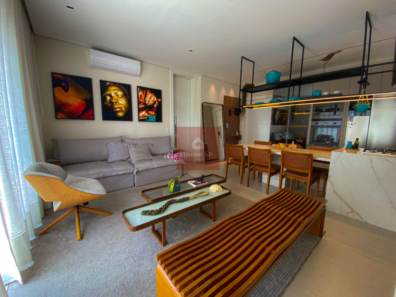 Os ambientes internos são integrados, têm pé-direito alto e excelente iluminação natural.